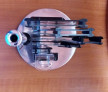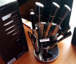 - Suportul din plastic, cu dimensiunile de 17 x 23 cm, ofera un loc sigur si organizat pentru a depozita toate instrumentele din set. Suportul este compact si nu ocupa mult spatiu pe blatul de bucatarie, dar este suficient de mare pentru a pastra toate cele 9 piese la indemana. Baza este rotativa iar suporturile pentru fiecare cutit sunt pivotabile pentru un acces facil la cutitul dorit.