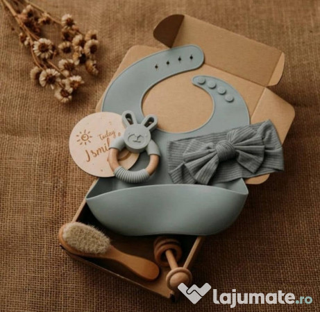 Set jucarii copil:jucarie, bentita, perie par, baveta, card foto.