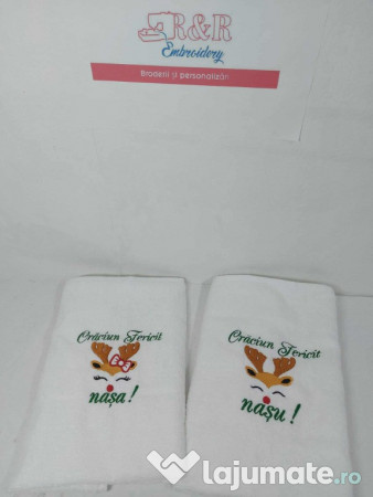 Setul de prosoape pentru nași, dimensiunea 50x100 cm, este realizat cu grijă și personalizat la comandă pentru a oferi un cadou elegant și unic. Broderia se poate adapta după preferințele clientului (nume, text, dată). Ideal pentru cununie sau botez, acest set adaugă o notă rafinată oricărui moment special.