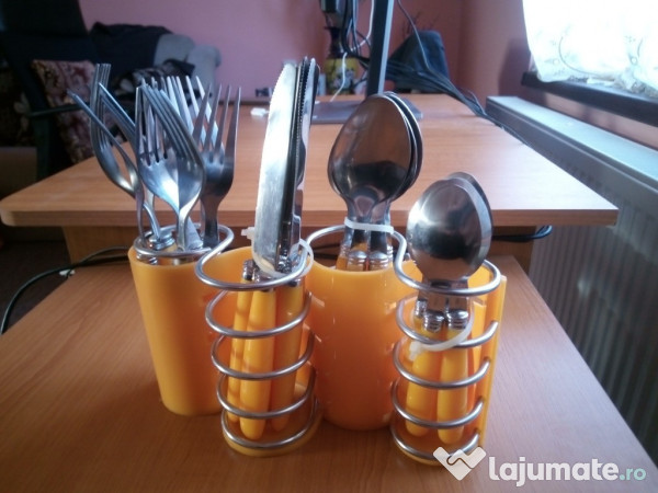 Vând set complet de tacâmuri marca JTC (model TC02), ideal pentru o familie de 6 persoane sau pentru cineva care tocmai s-a mutat în casă nouă și dorește un plus de culoare și organizare în bucătărie.