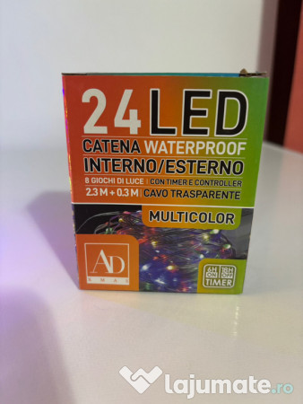 Adaugă culoare și magie decorului tău cu acest șir luminos format din 24 LED-uri multicolor, ideal atât pentru interior, cât și pentru exterior datorită protecției IP44 (rezistent la umezeală și stropi). Funcționează cu 3 baterii AA (nu sunt incluse), are 8 jocuri de lumină și un timer automat (6h ON / 18h OFF), astfel încât luminile se aprind și se sting singure, economisind energie.