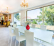 Zona de bucatarie si dining de la etajul inferior este concepută pentru a oferi atât confort, cât și versatilitate. Diningul are geamuri imense glisante care se deschid către curtea din spate, creând pe timpul verii o continuitate naturală între interior și exterior. Acest detaliu permite transformarea rapidă a casei într-un spațiu luminos, aerisit și prietenos, perfect pentru mese în familie sau evenimente sociale.