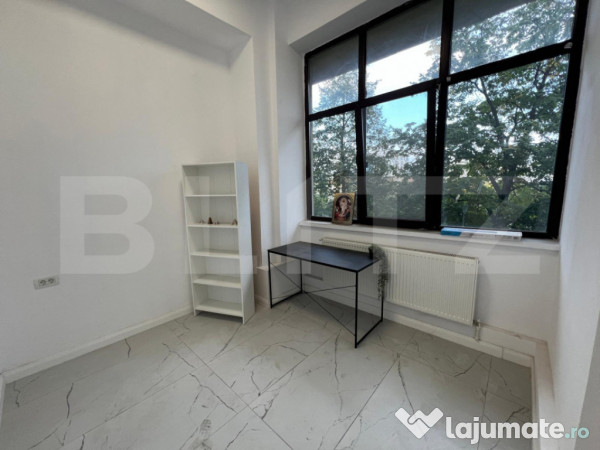 Acesta are o suprafata de 9 mp, se afla intr-o cladire cu mai multe spatii, accesul in spatiu este la comun pentru toti chiriasi, la fel si grupul sanitar tot la comun. Utiliatile sunt partial independente, curentul este independent, iar pentru caldura este o singura centrala pe imobil, suma totala la final de luna se va impartii la toti chiriasii. Spatiul dispune si de alte facilitati precum centrala termica.
