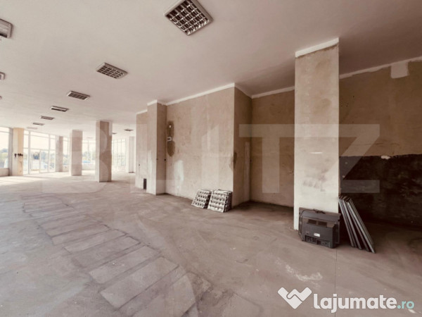 Spațiul este tip open space, ușor de compartimentat în funcție de nevoi, oferind o vitrină amplă pe toată lungimea fațadei – perfectă pentru branding, reclamă și vizibilitate maximă din stradă.