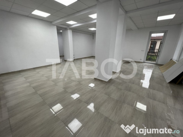 Spatiu comercial de inchiriat de 77 mp utili, situat la parterul unui bloc cu 3 etaje, pozitionat in zona Calea Surii Mici din Sibiu, dupa trecerea peste calea ferata. Spatiul are 2 incaperi, una generoasa in partea din fata cu vitrina direct in fata si inca una in spate, cu acces la grupul sanitar. Vitrina este la strada dintre blocuri deja locuite de catre proprietari si chiriasi.