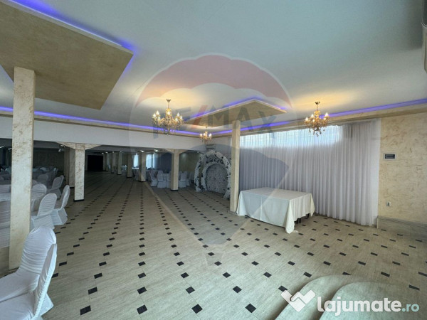 La parter se afla un restaurant mobilat si complet utilat cu sala de evenimente cu o capacitate de aproximativ 200 persoane, bucatarie profesionala cu toate ustensilele necesare, bar, sistem de ventilatie aer cald si aer rece, centrala termica pe gaz