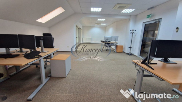 Koncept Imobiliare va ofera spre inchiriere un spatiu de birouri, in cartierul Andrei Muresanu, zona Parcului Engels. Spatiul, in suprafata utila de 110 mp, este compartimentat in: o camera foarte spatioasa de 56 plus un balcon de 8 mp, o sala pentru sedinte de 22 mp, bucatarie mobilata/utilata si 2 grupuri sanitare. Spatiul este luminos, fiind amplasat la mansarda inalta a unei cladiri noi de birouri (P+1+M). In pret sunt incluse si 2 locuri de parcare in curtea imobilului unde accesul este securizat, de asemenea se poate parca cu usurinta pe stradutele din zona. Se recomanda datorita amplasamentului foarte bun cu acces usor, al calitatii finisajelor/facilitatilor oferite si al standardelor ridicate de securitate pe care le indeplineste. Pentru detalii suplimentare, sau pentru a programa o vizionare, nu ezitati sa ne contactati telefonic, prin e-mail, sau direct la sediul agentiei noastre de pe strada Aviator Badescu nr. 19, Cluj-Napoca.