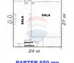 Parterul de 650 mp include două săli de mari dimensiuni și două grupuri sanitare, asigurând spațiul necesar pentru depozitare voluminoasă, producție sau amenajarea unui showroom extins. Accesul către etaj este realizat prin două scări interioare.