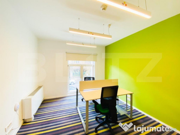 Va propun spre inchiriere 2 etaje dintr-un imobil individual finisat, situat intr-o zona exclusivista din Cluj-Napoca! Cladirea are suprafata totala de 652 mp, dispusa pe 4 niveluri (D+P+2E), incluzand grupuri sanitare, spatii de depozitare. Suprafata utila inchiriabila este de 300 mp pe 2 etaje a cate 150 de mp fiecare. Cladirea se ofera complet mobilata cu mese de lucru si scaune de birou, ofera serviciu de receptie si sala de mese cu bucatarie complet utilata (frigider, cuptor cu microunde, aparat de cafea, dozator de apa). Detine finisaje moderne, dispune de centrala de imobil, geamuri termopan, gresie si faianta moderna, curent trifazic, sistem supraveghere video, sistem de alarma, generator. Cladirea este compartimentata astfel: subsol- oficiu cu loc de luat masa, grup sanitar, camera tehnica, doua birouri. Parterul si etajele sunt compartimentate identic dupa cum urmeaza: open space, doua birouri, oficiu, grup sanitar, hol, casa scarii la fiecare nivel. Cladirea se inchiriaza integral, pe nivele sau pe birouri separate la pretul de 15 eur/mp, tarif ce include chiria neta plus toate utilitatile ( apa, gaz, curent) si serviciile de mentenanta tehnica pentru centrala de incendiu, senzori de fum, sistem de control acces, sistem de supraveghere video si toaletarea curtii. In pretul afisat nu este inclus TVA-ul.