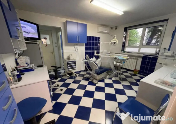 Acest spațiu medical este amenajat ca un cabinet stomatologic complet operațional, dispunând de două unituri dentare complet dotate, mobilier modular de specialitate, chiuvete multiple cu apă curentă, aer condiționat și sistem de ventilație. Zona de recepție este delimitată clar, cu o sală de așteptare confortabilă, decorată modern cu oglinzi și tapițerie albastră, conferind profesionalism și o atmosferă plăcută pentru pacienți.