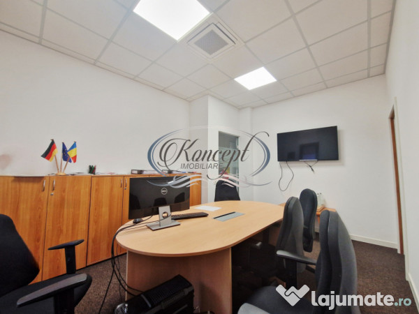 Spatiul se inchiriaza complet mobilat, cu birouri si scaune ergonomice, iar bucataria este dotata si mobilata, pregatita pentru utilizare zilnica. Cladirea beneficiaza de sistem de securitate modern, supraveghere video si alarma conectabila la dispecerat de interventii, oferind un nivel ridicat de siguranta.