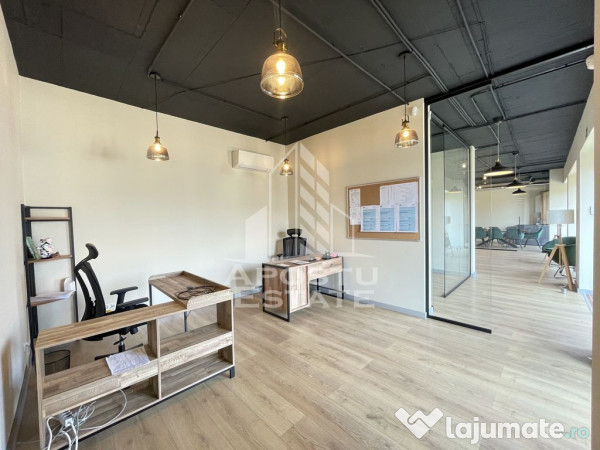 Spatiul beneficiaza de 5 usi de acces din strada si doua usi de acces din casa scarilor, este mobilat cu birouri, scaune de birou, bucatarie, dulapuri birou, masa de conferinta.