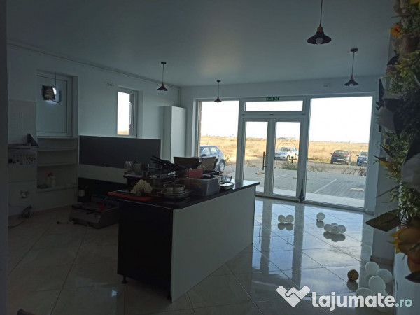 spatiu comercial cu o suprafață de aprox. 45mp, la care se adauga o terasa descoperita de aprox. 10mp(situata pe latura din fata a spatiului, aceasta fiind si zona de acces) si doua locuri de parcare(dispuse chiar in fata terasei), dar si un spatiu dispus la subsol(poate fi folosit ca vestiar sau/si pentru depozitare) cu acces pe scara betonata fixa, avand susprafata de aprox. 26mp.