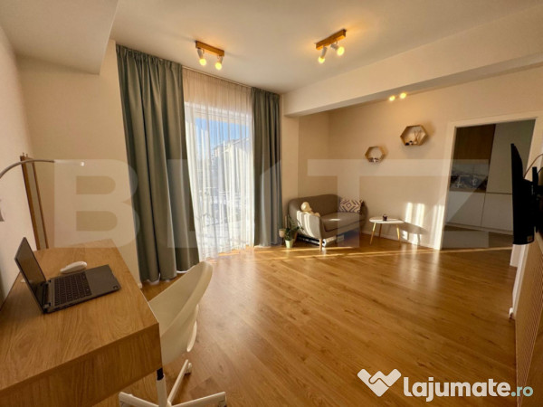 Cu o suprafață utilă de 37 mp, studioul impresionează prin designul său contemporan și prin luminozitatea spațiilor. Interiorul este amenajat cu finisaje de calitate superioară și mobilier modern, creând o atmosferă primitoare și relaxantă. Zona de zi este inteligent compartimentată, incluzând un spațiu de lucru dedicat, perfect pentru telemuncă sau studiu, și o zonă de relaxare cu TV.