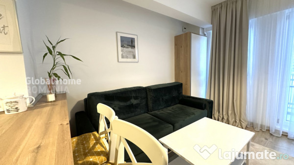 Studio-ul este situat la etaj intermediar, fiind foarte luminos, călduros și amenajat într-o atmosferă cozy și primitoare. Se închiriază complet mobilat și utilat, cu accent pe funcționalitate și confort.