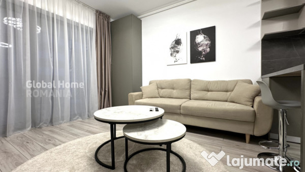 Studio-ul este situat la etaj intermediar, fiind foarte luminos, călduros și amenajat într-o atmosferă cozy și primitoare. Se închiriază complet mobilat și utilat, cu accent pe funcționalitate și confort.