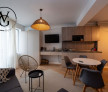 Studioul este complet utilat cu toate facilitățile moderne necesare, incluzând: plită, hotă, cuptor cu microunde, frigider incorporabil, mașină de spălat rufe, aer condiționat Mitsubishi, Smart TV LG și conexiune Wifi.