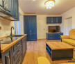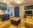 Living armonios asezonat in tonuri calde si o bucatarie open space.