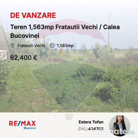 Vă propunem spre achiziție un teren cu amplasare excelentă, situat în inima comunei Frătăuții Vechi, la doar 500 de metri de Primărie, pe drumul principal asfaltat.