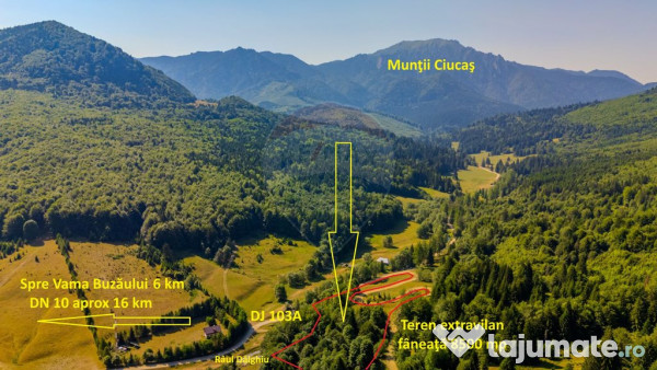 Teren extravilan, fâneață, neîmprejmuit, 8500 mp cu front de 65 m a DJ103A, situat în sat Dălghiu, comuna Vama Buzăului, la 13 km de Valea Zimbrilor si la 17 km de DN 10.