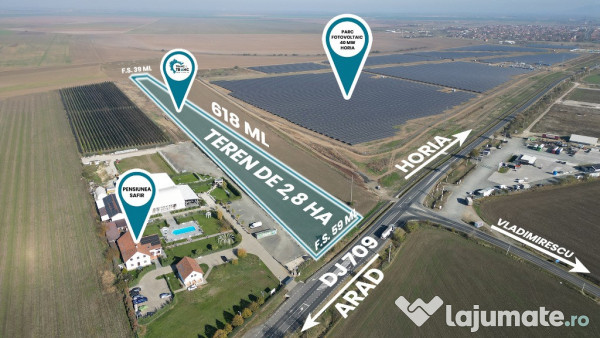 Terenul propus spre vânzare se află într-o locație strategică la intersecția drumului DJ709 Arad-Horia cu drumul ce vine dinspre Vladimirescu, beneficiind de accesibilitate excelentă și vizibilitate crescută. Suprafața generoasă de 28.000 m² oferă oportunități multiple de dezvoltare pentru proiecte industriale, rezidențiale, HoReCa sau energetice (parc fotovoltaic).