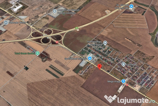 Teren in suprafata totala de 50.000 mp, aflat in extravilanul localitatii Popesti-Leordeni are o forma regulata, dreptunghiulara, cu o deschidere de aprox. 170 ml la Sos. Oltenitei si la o distanta de ~400 metri de Autostrada de Centura a Bucurestiului (A0).