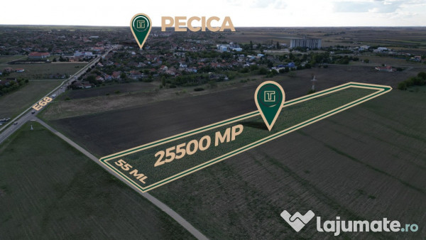 La doar 300 de metri de intrarea în Pecica și la 1,5 km de nodul de autostradă, se află un teren rar pe piață de 25.500 mp de teren intravilan agricol, cu un front stradal generos de 55 metri la un drum asfaltat de 4 m, aflat la numai 200 m de drumul european si 200 m de o zona industriala, agricola