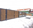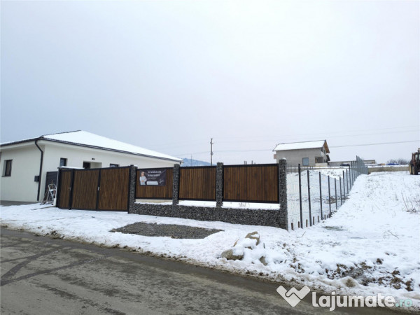 Proprietatea este ingradita integral, gardul fiind realizat din stalpi metalici si panouri de plasa, oferind siguranta si delimitare clara. Accesul se face printr-o poarta solida, cu cadru metalic si elemente din lemn tratat, care completeaza armonios aspectul general al proprietatii.