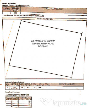 Se oferă spre vânzare un teren intravilan cu suprafața de 622 mp, având o deschidere de 22 ml la stradă. Terenul beneficiază de toate utilitățile disponibile în zonă: apă, canalizare, curent electric și gaze naturale.