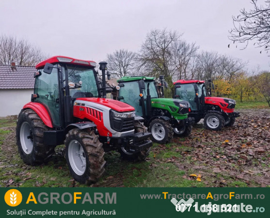 Tractoarele AgroFarm vin full-option din fabrica, la preturi la care concurenta vinde inca tractoare „chele”. Au cabina inchisa cu aer conditionat si incalzire, scaun cu perna de aer, comenzi tip autoturism, servodirectie hidraulica foarte usoara, frana pe aer foarte usoara la pedala, cutie de viteze cu inversor inainte–inapoi la maneta, cu 12+12 trepte (12 viteze inainte si 12 viteze inapoi), ambreiaj dublu cu disc mare de 12 inch, dimensionat pentru cuplul ridicat al motorului de 380 Nm, gandit pentru lucru serios cu plug, freza, remorca si alte utilaje grele, motoare diesel in 4 cilindri, de cilindree mare – 4.200 cm³ – cu cuplu maxim la doar 1.300 rpm, instalatie hidraulica puternica, cu 3 iesiri hidraulice, aripi fata, priza electrica pentru remorca (7 pini), proiectoare si lumini de lucru, girofar, martori de avertizare in bord, ecartament reglabil la roti pentru adaptare la diferite distante intre randuri, sistem anticoroziv si anvelope agricole radiale mari, cu profil adanc, pentru tractiune foarte buna in camp (nu cauciucuri diagonale ieftine). Toate aceste dotari sunt deja incluse in pret – primesti un tractor complet echipat mai ieftin decat ofera concurenta un tractor gol, fara nici o optiune.