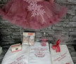 Setul conține tot ce este necesar pentru ceremonia de botez: prosop bebe, prosop pentru preot, pânză de mir, fașă, sticluță pentru mir, săpunel, cutie pentru șuvița de păr, rochiță delicată și papucei asortați.