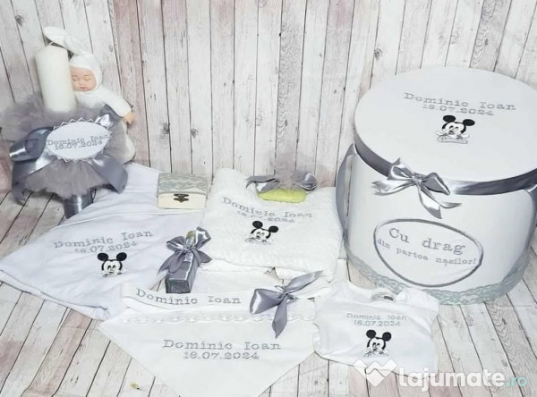 Un set special creat pentru ziua de botez, personalizat cu numele bebelușului sau mesajul dorit, realizat cu grijă și atenție la detalii.