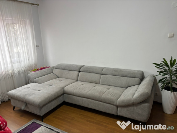 Canapea de colț extensibilă, cu spațiu de depozitare, în stare bună, ideală pentru a adăuga confort și spațiu în living. Poate fi utilizată ca și canapea sau extinsă pentru a oferi mai mult loc de odihnă.