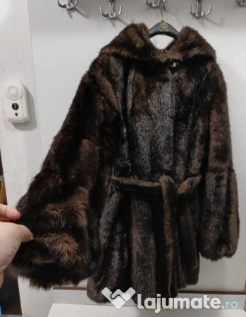 Haina elegantă de blană ecologica de culoare maro, prevăzută cu o glugă. O piesă vestimentară perfectă pentru a-ți completa ținuta de iarnă și a te menține caldă și la modă în același timp ,cu predare personală!
