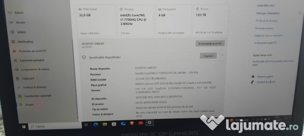 Vând leptop asus Rog gaming, laptop vine cu windows 10 instalat, insoțit cu încărcător original asus, procesor i7 32GB RAM merge pusa placuța maxim 50GB RAM ,Intel(R) Core(TM)i7-7700HQ CPU @ 2.80GHz 4GB Placă Grafică ,Spațiu de stocare ssd 1TB merge pusă placuța maxim SSD5TB ,GB 932 HDD, Are 3 porturi USB, 2 porturi hdmi,1 port tip C, 1 port aux, sidi-drive, lumi ambietale,cu wifi, wireless, bluetooth,cameră web, 1 port mufă internet, microfon incorporat, Bateria ține 2,3 ore vine instalat dacă doriți cu jocurile GTA V, fiveM,Duce GTA VI,Forza Horizan pe care doriți Counter Strike ,Pubg Free Fire și încă un joc merg jocurile merg la maxim fără nicio problemă e leptop de gaming rulează ori ce joc.