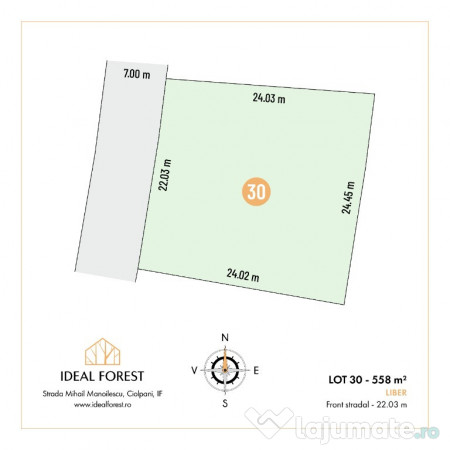 Oferim spre vanzare lot 30 in suprafata de 558mp, front stradal 22,03m.