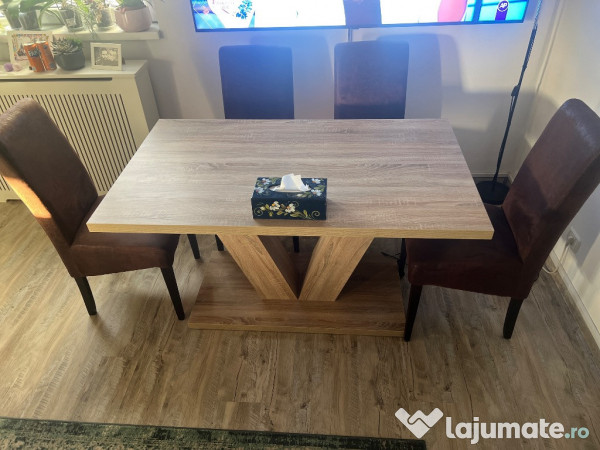 Masă “Venetia” solidă din lemn, de culoare stejar, dimensiuni L/H/A 135/75.5/80 CM. Însoțită de 4 scaune “Cancan” din piele ecologica de culoare maro inchis, dimensiuni L/H/A 46/97/56 CM. Un set de mobilier achizitionat de la XXXLutz, acum nu mai este la ei in oferta (poza din aplicatie cu achizitia). Pretul este usor negociabil, ridicare din Domnesti, Ilfov.
