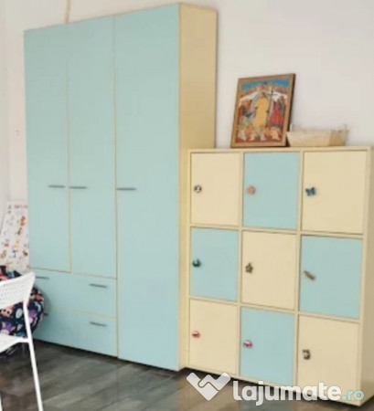Set de mobiler pentru afterschool/gradinita.setul contine:2 vestiare cu cate 9 compartimente, 2 casetiere tot cu cate 9 compartimente, un dulap si o banca.