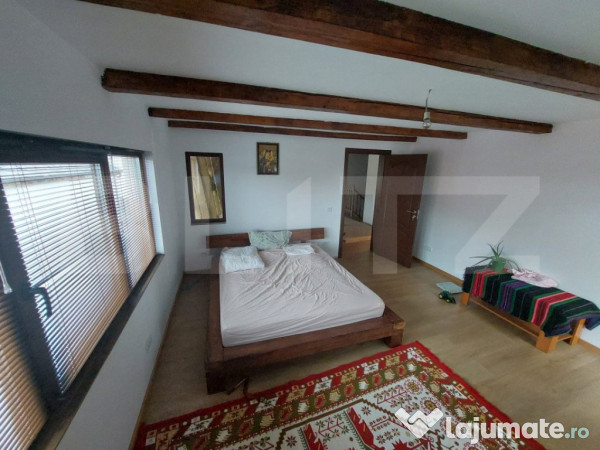 Unul dintre cele mai mari avantaje ale acestei case este livingul spațios, dotat cu un șemineu din cărămidă rustică – ideal pentru serile de iarnă în familie sau cu prietenii. Atmosfera caldă și primitoare va transforma fiecare moment petrecut acasă într-o adevărată relaxare.
