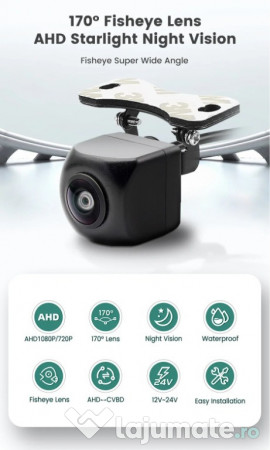Cameră Auto Video AHD 1920x1080P Marsarier 170 grade -unghi Mers Înapoi, cu șuruburi și suport de prindere (bracket), cu cabluri video 6m de racordare; compatibil cu vw, audi, bmw, skoda, opel, ford, seat, dacia, renault, chevrolet....etc.