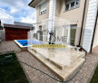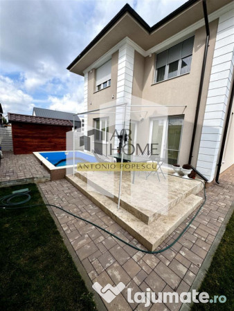 Dotari exterioare: teren imprejmuit cu gard de beton si metal, alei pietonale si auto betonate si pavate cu dale (Semmerlock), gazon, sistem de irigatie automatizat, piscina, magazie exterioara din lemn, terasa placata cu travertin, rulouri exterioare din PVC, tuya etc.