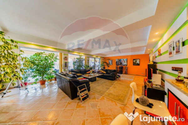 Imobilul beneficiază de o terasa superba in suprafata de 80 mp acoperita cu gresie anti-alunecare importata din Spania , piscina de 66mp(11/6) unde va puteți răcorii in zilele toride , o camera tehnica cu baie de servici langa piscina , iaz cu pesti ,cuptor special amenajat .