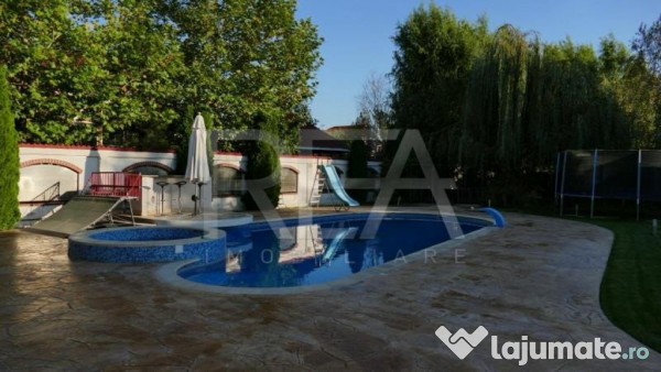 Această vilă impresionantă oferă un living spectaculos de 90 mp, pe două niveluri, cu șemineu placat cu piatră naturală. La parter se află și o bucătărie modernă de 20 mp, cu perete de sticlă sablată, cămară, un dormitor cu baie proprie, o terasă acoperită cu grătar încorporat, cameră tehnică cu spălătorie și garaj pentru două mașini. Casa beneficiază de încălzire prin pardoseală, centrală performantă și sistem de aspirare centralizat.