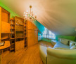Un detaliu arhitectural spectaculos este luminoarul triunghiular amplasat central, care oferă un flux natural de lumină în interiorul vilei și contribuie la senzația de eleganță și unicitate. Vila se vinde complet mobilată, cu mobilier din lemn masiv, în stil clasic, într-o stare excelentă — perfectă pentru cei care apreciază rafinamentul și calitatea mobilierului autentic.