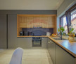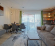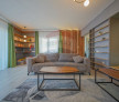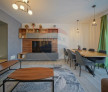 Acesta este generos, cu un open space care îmbină livingul, diningul și bucătăria într-un singur flux armonios. Pardoselile din lemn natural adaugă căldură, iar culorile neutre creează un ambient primitor.