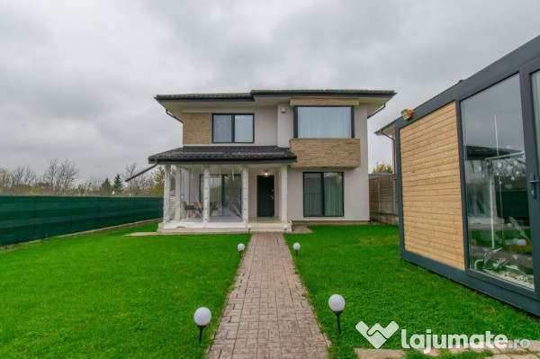 Vă invit să descoperiți o locuință cocheta, amplasată într-un complex privat cu acces securizat, compus din doar 7 case, oferind intimitate, liniște și o priveliște superbă asupra lacului. Proprietatea, finalizată în 2021, are un design modern, atenția la detalii și calitatea execuției, existand fotografii din absolut toate fazele de executie ale constructiei.