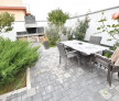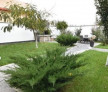 Curte amenajată cu gazon, pomi fructiferi, arbuști și flori