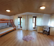 Detine spatiu de joaca dotat cu tobogan, leagan si alte accesorii pentru copii.