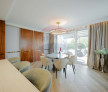 De la bucătărie avem accesul spre living și zona de zi, o încăpere spațioasă și luminoasă, cu șemineu și cu o masă de dining pentru 8 persoane, ideală pentru reuniuni de familie. Mobilierul, cu accente moderne în tonuri calde, este pus în valoare de lumina naturală ce pătrunde prin ferestrele mari.