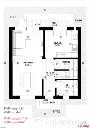 • Parter: living generos și luminos, bucătărie spațioasă cu acces direct la terasă, grup sanitar, hol de acces și spațiu de depozitare
